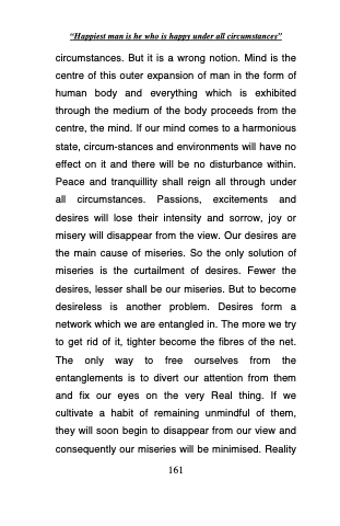 circumstances. But it is a wrong notion. Mind is the centre of this outer expansion of man in the form of human body and everything which is exhibited through the medium of the body proceeds from the centre, the mind. If our mind comes to a harmonious state, circum-stances and environments will have no effect on it and there will be no disturbance within. Peace and tranquillity shall reign all through under all circumstances. Passions, excitements and desires will lose their intensity and sorrow, joy or misery will disappear from the view. Our desires are the main cause of miseries. So the only solution of miseries is the curtailment of desires. Fewer the desires, lesser shall be our miseries. But to become desireless is another problem. Desires form a network which we are entangled in. The more we try to get rid of it, tighter become the fibres of the net. The only way to free ourselves from the entanglements is to divert our attention from them and fix our eyes on the very Real thing. If we cultivate a habit of remaining unmindful of them, they will soon begin to disappear from our view and consequently our miseries will be minimised. Reality