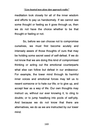 So, before we can choose not to compromise ourselves, we must first become acutely and intensely aware of those thoughts of ours that may be holding some secret seed of self-defeat. If we do not know that we are doing this kind of compromised thinking or acting out the emotional counterparts what else can follow but defeat in our endeavour. For example, the lower mind through its harmful inner voices and emotional forces may tell us to resent someone or to hate our life; or to give up, and accept fear as a way of life. Our own thoughts may instruct us, without our ever knowing it, to cling to doubts; or to jump headlong into pools of self-pity. And because we do not know that there are alternatives, we do as we are instructed by our lower mind.