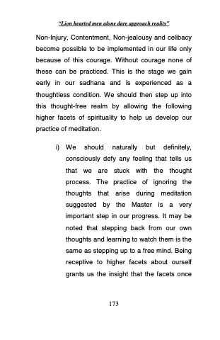 Non-Injury, Contentment, Non-jealousy and celibacy become possible to be implemented in our life only because of this courage. Without courage none of these can be practiced. This is the stage we gain early in our sadhana and is experienced as a thoughtless condition. We should then step up into this thought-free realm by allowing the following higher facets of spirituality to help us develop our practice of meditation.