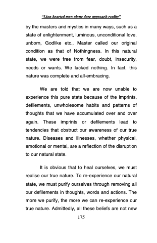 by the masters and mystics in many ways, such as a state of enlightenment, luminous, unconditional love, unborn, Godlike etc., Master called our original condition as that of Nothingness. In this natural state, we were free from fear, doubt, insecurity, needs or wants. We lacked nothing. In fact, this nature was complete and all-embracing.