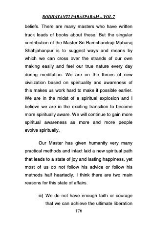 beliefs. There are many masters who have written truck loads of books about these. But the singular contribution of the Master Sri Ramchandraji Maharaj Shahjahanpur is to suggest ways and means by which we can cross over the strands of our own making easily and feel our true nature every day during meditation. We are on the throes of new civilization based on spirituality and awareness of this makes us work hard to make it possible earlier. We are in the midst of a spiritual explosion and I believe we are in the exciting transition to become more spiritually aware. We will continue to gain more spiritual awareness as more and more people evolve spiritually.