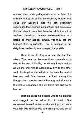 and carry too much garbage with us in our lives. It is only by letting go of this unnecessary burden that cloud our Essence that we can eventually experience the Essence in its natural and pure state. It is important to note that these two skills that a true aspirant develops, namely self-awareness and letting go may appear simple, yet they are the hardest skills to cultivate. That is because in our daily lives, we hardly ever sharpen these skills.