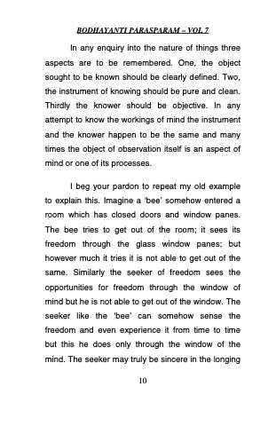 I beg your pardon to repeat my old example to explain this. Imagine a ‘bee’ somehow entered a room which has closed doors and window panes. The bee tries to get out of the room; it sees its freedom through the glass window panes; but however much it tries it is not able to get out of the same. Similarly the seeker of freedom sees the opportunities for freedom through the window of mind but he is not able to get out of the window. The seeker like the ‘bee’ can somehow sense the freedom and even experience it from time to time but this he does only through the window of the mind. The seeker may truly be sincere in the longing