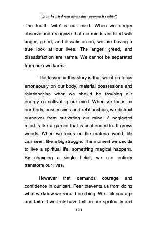 The lesson in this story is that we often focus erroneously on our body, material possessions and relationships when we should be focusing our energy on cultivating our mind. When we focus on our body, possessions and relationships, we distract ourselves from cultivating our mind. A neglected mind is like a garden that is unattended to. It grows weeds. When we focus on the material world, life can seem like a big struggle. The moment we decide to live a spiritual life, something magical happens. By changing a single belief, we can entirely transform our lives.