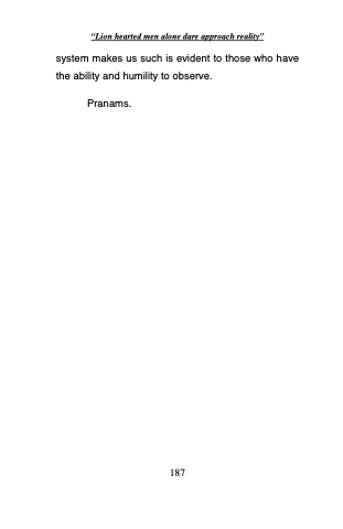 “Lion hearted men alone dare approach reality” system makes us such is evident to those who have the ability and humility to observe. Pranams. 187