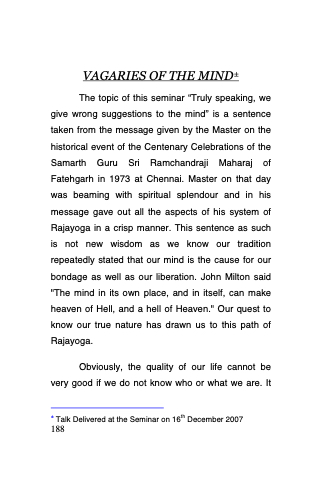 The topic of this seminar “Truly speaking, we give wrong suggestions to the mind” is a sentence taken from the message given by the Master on the historical event of the Centenary Celebrations of the Samarth Guru Sri Ramchandraji Maharaj of Fatehgarh in 1973 at Chennai. Master on that day was beaming with spiritual splendour and in his message gave out all the aspects of his system of Rajayoga in a crisp manner. This sentence as such is not new wisdom as we know our tradition repeatedly stated that our mind is the cause for our bondage as well as our liberation. John Milton said "The mind in its own place, and in itself, can make heaven of Hell, and a hell of Heaven." Our quest to know our true nature has drawn us to this path of Rajayoga.