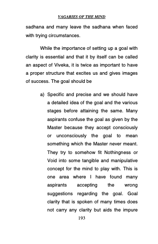 a) Specific and precise and we should have a detailed idea of the goal and the various stages before attaining the same. Many aspirants confuse the goal as given by the Master because they accept consciously or unconsciously the goal to mean something which the Master never meant. They try to somehow fit Nothingness or Void into some tangible and manipulative concept for the mind to play with. This is one area where I have found many aspirants accepting the wrong suggestions regarding the goal. Goal clarity that is spoken of many times does not carry any clarity but aids the impure