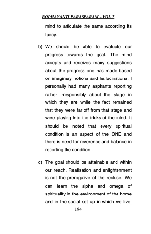 c) The goal should be attainable and within our reach. Realisation and enlightenment is not the prerogative of the recluse. We can learn the alpha and omega of spirituality in the environment of the home and in the social set up in which we live.