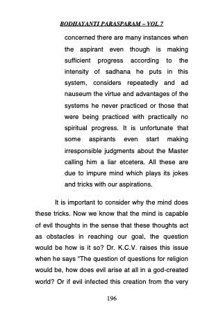 concerned there are many instances when the aspirant even though is making sufficient progress according to the intensity of sadhana he puts in this system, considers repeatedly and ad nauseum the virtue and advantages of the systems he never practiced or those that were being practiced with practically no spiritual progress. It is unfortunate that some aspirants even start making irresponsible judgments about the Master calling him a liar etcetera. All these are due to impure mind which plays its jokes and tricks with our aspirations.