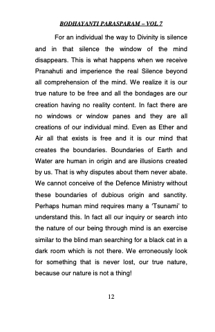 For an individual the way to Divinity is silence and in that silence the window of the mind disappears. This is what happens when we receive Pranahuti and imperience the real Silence beyond all comprehension of the mind. We realize it is our true nature to be free and all the bondages are our creation having no reality content. In fact there are no windows or window panes and they are all creations of our individual mind. Even as Ether and Air all that exists is free and it is our mind that creates the boundaries. Boundaries of Earth and Water are human in origin and are illusions created by us. That is why disputes about them never abate. We cannot conceive of the Defence Ministry without these boundaries of dubious origin and sanctity. Perhaps human mind requires many a ‘Tsunami’ to understand this. In fact all our inquiry or search into the nature of our being through mind is an exercise similar to the blind man searching for a black cat in a dark room which is not there. We erroneously look for something that is never lost, our true nature, because our nature is not a thing!