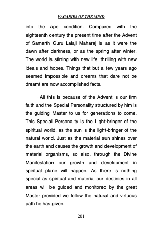 into the ape condition. Compared with the eighteenth century the present time after the Advent of Samarth Guru Lalaji Maharaj is as it were the dawn after darkness, or as the spring after winter. The world is stirring with new life, thrilling with new ideals and hopes. Things that but a few years ago seemed impossible and dreams that dare not be dreamt are now accomplished facts.