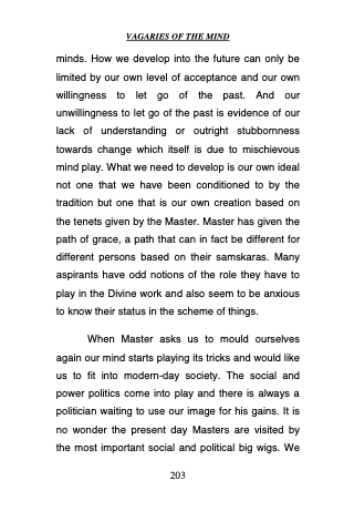 When Master asks us to mould ourselves again our mind starts playing its tricks and would like us to fit into modern-day society. The social and power politics come into play and there is always a politician waiting to use our image for his gains. It is no wonder the present day Masters are visited by the most important social and political big wigs. We