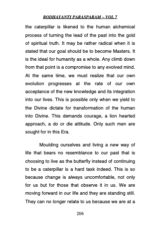 the caterpillar is likened to the human alchemical process of turning the lead of the past into the gold of spiritual truth. It may be rather radical when it is stated that our goal should be to become Masters. It is the ideal for humanity as a whole. Any climb down from that point is a compromise to any evolved mind. At the same time, we must realize that our own evolution progresses at the rate of our own acceptance of the new knowledge and its integration into our lives. This is possible only when we yield to the Divine dictate for transformation of the human into Divine. This demands courage, a lion hearted approach, a do or die attitude. Only such men are sought for in this Era.