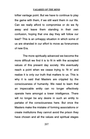 loftier vantage point. But we have to continue to play the game with them, if we still want them in our life. Can we really afford to compromise or do we fly away and leave them standing in their own confusion, hoping that one day they will follow our lead? This is an unhappy situation in which some of us are stranded in our effort to move as forerunners of new Era.