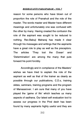 reason for some persons who have blown out of proportion the role of Pranahuti and the role of the master. The words master and Master have different meanings and unfortunately one was confused with the other by many. Having created the confusion the role of the aspirant was sought to be reduced to nothing. Rev.Babuji Maharaj has made it clear through his messages and writings that the aspirants have a great role to play as well as the preceptors. The articles ‘They lost the Ocean’ and ‘Determination’ are among the many that puts forward his point forcibly.