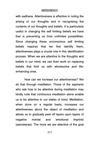 with sadhana. Attentiveness is effective in noting the arising of our thoughts and in recognising the contents of our thoughts and beliefs. It is particularly useful in changing the self limiting beliefs we have that is preventing us from unlimited possibilities. Since changing these unconscious self limiting beliefs requires that we first identify them, attentiveness plays a crucial role in this identification process. When we are attentive to the thoughts and beliefs in our mind, we can then work on replacing beliefs that limit us with wholesome and life- enhancing ones.