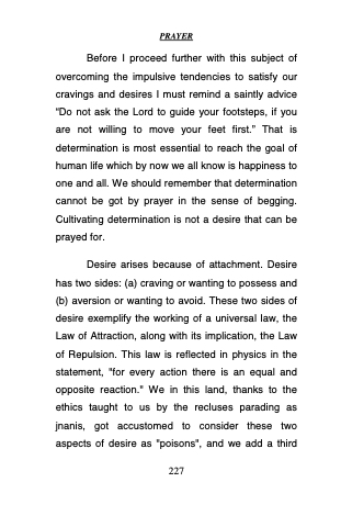 Desire arises because of attachment. Desire has two sides: (a) craving or wanting to possess and (b) aversion or wanting to avoid. These two sides of desire exemplify the working of a universal law, the Law of Attraction, along with its implication, the Law of Repulsion. This law is reflected in physics in the statement, "for every action there is an equal and opposite reaction." We in this land, thanks to the ethics taught to us by the recluses parading as jnanis, got accustomed to consider these two aspects of desire as "poisons", and we add a third