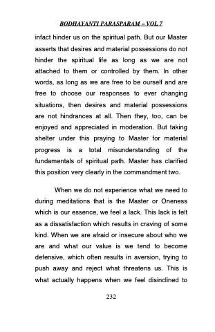 infact hinder us on the spiritual path. But our Master asserts that desires and material possessions do not hinder the spiritual life as long as we are not attached to them or controlled by them. In other words, as long as we are free to be ourself and are free to choose our responses to ever changing situations, then desires and material possessions are not hindrances at all. Then they, too, can be enjoyed and appreciated in moderation. But taking shelter under this praying to Master for material progress is a total misunderstanding of the fundamentals of spiritual path. Master has clarified this position very clearly in the commandment two.