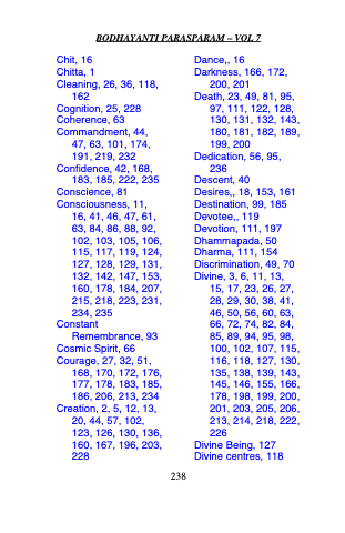 Desires,, 18, 153, 161 Destination, 99, 185 Devotee,, 119 Devotion, 111, 197 Dhammapada, 50 Dharma, 111, 154 Discrimination, 49, 70 Divine, 3, 6, 11, 13,
