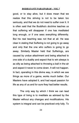 good, or to stay alive, but it does mean that we realize that this striving is not to be taken too seriously, and that we do not need to suffer over it. It is often said that the Buddha's doctrine teaches us that suffering will disappear if one has meditated long enough, or if one sees everything differently. But his real teaching was not that at all. He was clear in stating that Suffering is not going to go away and only that the one who suffers is going to go away. Similarly Master held that Sufferings, are caused by undue attachment and being attached to one side of a duality and expect that to win always is as silly as being attached to throwing a ball in the air and expect it never to come down. It will not happen. In fact, operating in this divine way, in which we see things as more of a game, works much better. Our Masters have adopted it, and had equal passion for life as any of us and for sure they had better results.