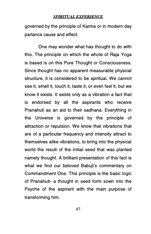 One may wonder what has thought to do with this. The principle on which the whole of Raja Yoga is based is on this Pure Thought or Consciousness. Since thought has no apparent measurable physical structure, it is considered to be spiritual. We cannot see it, smell it, touch it, taste it, or even feel it, but we know it exists. It exists only as a vibration a fact that is endorsed by all the aspirants who receive Pranahuti as an aid to their sadhana. Everything in the Universe is governed by the principle of attraction or repulsion. We know that vibrations that are of a particular frequency and intensity attract to themselves alike vibrations, to bring into the physical world the result of the initial seed that was planted namely thought. A brilliant presentation of this fact is what we find our beloved Babuji’s commentary on Commandment One. This principle is the basic logic of Pranahuti- a thought in seed form sown into the Psyche of the aspirant with the main purpose of transforming him.