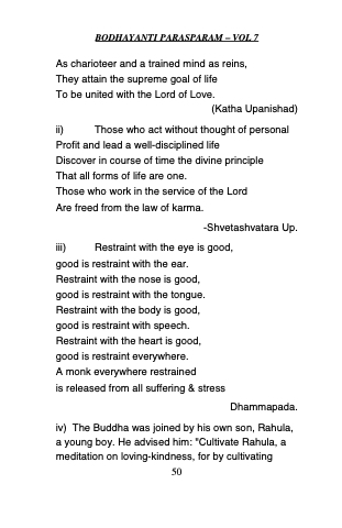 iv) The Buddha was joined by his own son, Rahula, a young boy. He advised him: "Cultivate Rahula, a meditation on loving-kindness, for by cultivating