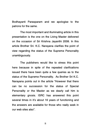 The most important and illuminating article in this presentation is the one on the Living Master delivered on the occasion of Sri Krishna Jayanthi 2008. In this article Brother Sri. K.C. Narayana clarifies the point of view regarding the status of the Supreme Personality unambiguously.