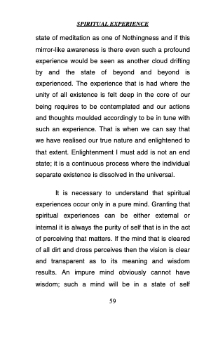 state of meditation as one of Nothingness and if this mirror-like awareness is there even such a profound experience would be seen as another cloud drifting by and the state of beyond and beyond is experienced. The experience that is had where the unity of all existence is felt deep in the core of our being requires to be contemplated and our actions and thoughts moulded accordingly to be in tune with such an experience. That is when we can say that we have realised our true nature and enlightened to that extent. Enlightenment I must add is not an end state; it is a continuous process where the individual separate existence is dissolved in the universal.