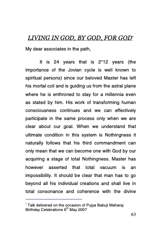 It is 24 years that is 2*12 years (the importance of the Jovian cycle is well known to spiritual persons) since our beloved Master has left his mortal coil and is guiding us from the astral plane where he is enthroned to stay for a millennia even as stated by him. His work of transforming human consciousness continues and we can effectively participate in the same process only when we are clear about our goal. When we understand that ultimate condition in this system is Nothingness it naturally follows that his third commandment can only mean that we can become one with God by our acquiring a stage of total Nothingness. Master has however asserted that total vacuum is an impossibility. It should be clear that man has to go beyond all his individual creations and shall live in total consonance and coherence with the divine