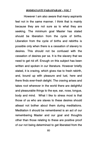 However I am also aware that many aspirants feel not in the same manner. I think that is mainly because they are not sure as to what they are seeking. The minimum goal Master has stated should be liberation from the cycle of births. Liberation from the cycle of births and rebirths is possible only when there is a cessation of slavery to desires. This should not be confused with the cessation of desires per se. It is the slavery that we need to get rid off. Enough on this subject has been written and spoken in our literature. However briefly stated, it is craving, which gives rise to fresh rebirth, and, bound up with pleasure and lust, here and there finds ever-fresh delight. The craving arises and takes root wherever in the world there are delightful and pleasurable things to the eye, ear, nose, tongue, body and mind. What I like to stress most is that those of us who are slaves to these desires should atleast not bother about them during meditations. Meditation it should be remembered is an act of our remembering Master and our goal and thoughts other than those relating to these are positive proof of our not being determined to get liberated from the