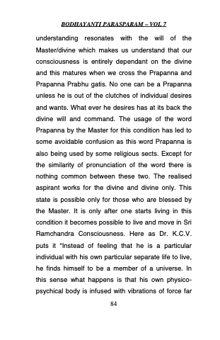 understanding resonates with the will of the Master/divine which makes us understand that our consciousness is entirely dependant on the divine and this matures when we cross the Prapanna and Prapanna Prabhu gatis. No one can be a Prapanna unless he is out of the clutches of individual desires and wants. What ever he desires has at its back the divine will and command. The usage of the word Prapanna by the Master for this condition has led to some avoidable confusion as this word Prapanna is also being used by some religious sects. Except for the similarity of pronunciation of the word there is nothing common between these two. The realised aspirant works for the divine and divine only. This state is possible only for those who are blessed by the Master. It is only after one starts living in this condition it becomes possible to live and move in Sri Ramchandra Consciousness. Here as Dr. K.C.V. puts it “Instead of feeling that he is a particular individual with his own particular separate life to live, he finds himself to be a member of a universe. In this sense what happens is that his own physico- psychical body is infused with vibrations of force far