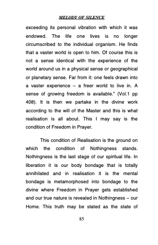 exceeding its personal vibration with which it was endowed. The life one lives is no longer circumscribed to the individual organism. He finds that a vaster world is open to him. Of course this is not a sense identical with the experience of the world around us in a physical sense or geographical or planetary sense. Far from it: one feels drawn into a vaster experience – a freer world to live in. A sense of growing freedom is available.” (Vol.1 pp 408). It is then we partake in the divine work according to the will of the Master and this is what realisation is all about. This I may say is the condition of Freedom in Prayer.