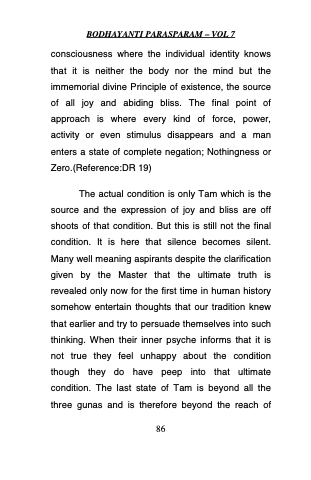 The actual condition is only Tam which is the source and the expression of joy and bliss are off shoots of that condition. But this is still not the final condition. It is here that silence becomes silent. Many well meaning aspirants despite the clarification given by the Master that the ultimate truth is revealed only now for the first time in human history somehow entertain thoughts that our tradition knew that earlier and try to persuade themselves into such thinking. When their inner psyche informs that it is not true they feel unhappy about the condition though they do have peep into that ultimate condition. The last state of Tam is beyond all the three gunas and is therefore beyond the reach of