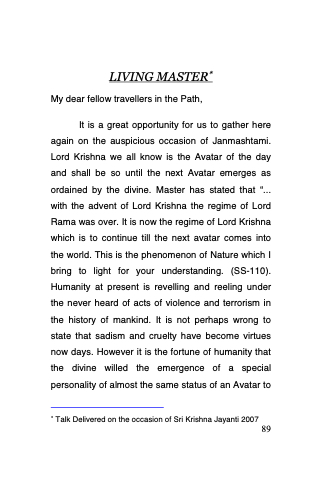 It is a great opportunity for us to gather here again on the auspicious occasion of Janmashtami. Lord Krishna we all know is the Avatar of the day and shall be so until the next Avatar emerges as ordained by the divine. Master has stated that “... with the advent of Lord Krishna the regime of Lord Rama was over. It is now the regime of Lord Krishna which is to continue till the next avatar comes into the world. This is the phenomenon of Nature which I bring to light for your understanding. (SS-110). Humanity at present is revelling and reeling under the never heard of acts of violence and terrorism in the history of mankind. It is not perhaps wrong to state that sadism and cruelty have become virtues now days. However it is the fortune of humanity that the divine willed the emergence of a special personality of almost the same status of an Avatar to