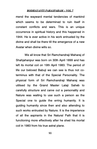 mend the wayward mental tendencies of mankind which seems to be determined to ruin itself in constant conflicts and wars. This is an unique occurrence in spiritual history and this happened in 1944. He is ever active in his work entrusted by the divine and shall be there till the emergence of a new Avatar when divine wills so.