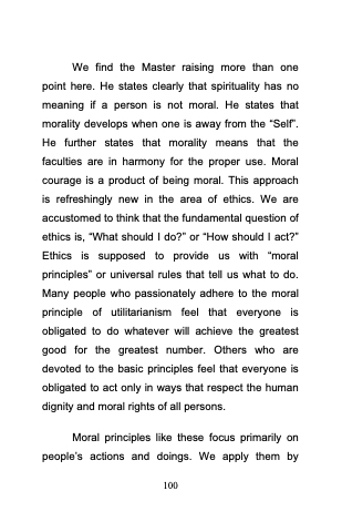 We find the Master raising more than one point here. He states clearly that spirituality has no meaning if a person is not moral. He states that morality develops when one is away from the “Self”. He further states that morality means that the faculties are in harmony for the proper use. Moral courage is a product of being moral. This approach is refreshingly new in the area of ethics. We are accustomed to think that the fundamental question of ethics is, “What should I do?” or “How should I act?” Ethics is supposed to provide us with “moral principles” or universal rules that tell us what to do. Many people who passionately adhere to the moral principle of utilitarianism feel that everyone is obligated to do whatever will achieve the greatest good for the greatest number. Others who are devoted to the basic principles feel that everyone is obligated to act only in ways that respect the human dignity and moral rights of all persons.