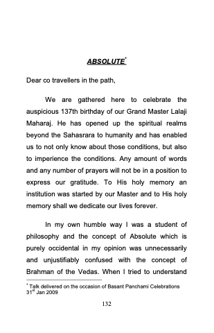 We are gathered here to celebrate the auspicious 137th birthday of our Grand Master Lalaji Maharaj. He has opened up the spiritual realms beyond the Sahasrara to humanity and has enabled us to not only know about those conditions, but also to imperience the conditions. Any amount of words and any number of prayers will not be in a position to express our gratitude. To His holy memory an institution was started by our Master and to His holy memory shall we dedicate our lives forever.