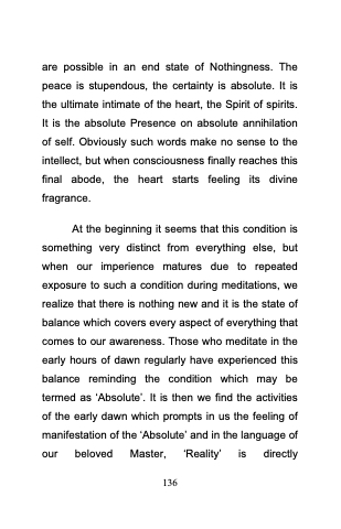 At the beginning it seems that this condition is something very distinct from everything else, but when our imperience matures due to repeated exposure to such a condition during meditations, we realize that there is nothing new and it is the state of balance which covers every aspect of everything that comes to our awareness. Those who meditate in the early hours of dawn regularly have experienced this balance reminding the condition which may be termed as „Absolute‟. It is then we find the activities of the early dawn which prompts in us the feeling of manifestation of the „Absolute‟ and in the language of our beloved Master, „Reality‟ is directly