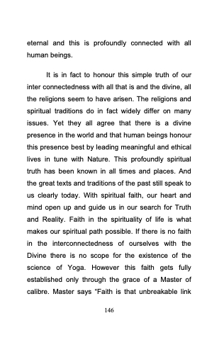 It is in fact to honour this simple truth of our inter connectedness with all that is and the divine, all the religions seem to have arisen. The religions and spiritual traditions do in fact widely differ on many issues. Yet they all agree that there is a divine presence in the world and that human beings honour this presence best by leading meaningful and ethical lives in tune with Nature. This profoundly spiritual truth has been known in all times and places. And the great texts and traditions of the past still speak to us clearly today. With spiritual faith, our heart and mind open up and guide us in our search for Truth and Reality. Faith in the spirituality of life is what makes our spiritual path possible. If there is no faith in the interconnectedness of ourselves with the Divine there is no scope for the existence of the science of Yoga. However this faith gets fully established only through the grace of a Master of calibre. Master says “Faith is that unbreakable link