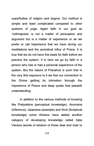 superfluities of religion and dogma. Our method is simple and least complicated compared to other systems of yoga. Again faith in our goal as „nothingness‟ is not a matter of persuasion and argument but is a matter of experience or as we prefer to call Imperience that we have during our meditations and the periodical influx of Prana. It is true that we do not have this basis for faith before we practice the system. It is here we go by faith in a person who has or had a personal experience of the system. But the nature of Pranahuti is such that in the very first exposure to it we feel our connection to the Divine getting its intimation through the imperience of Peace and deep quiets that passeth understanding.