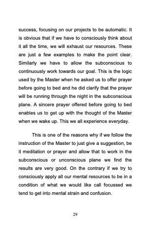 success, focusing on our projects to be automatic. It is obvious that if we have to consciously think about it all the time, we will exhaust our resources. These are just a few examples to make the point clear. Similarly we have to allow the subconscious to continuously work towards our goal. This is the logic used by the Master when he asked us to offer prayer before going to bed and he did clarify that the prayer will be running through the night in the subconscious plane. A sincere prayer offered before going to bed enables us to get up with the thought of the Master when we wake up. This we all experience everyday.