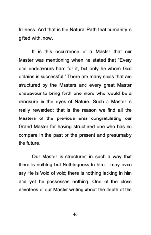 Our Master is structured in such a way that there is nothing but Nothingness in him. I may even say He is Void of void; there is nothing lacking in him and yet he possesses nothing. One of the close devotees of our Master writing about the depth of the