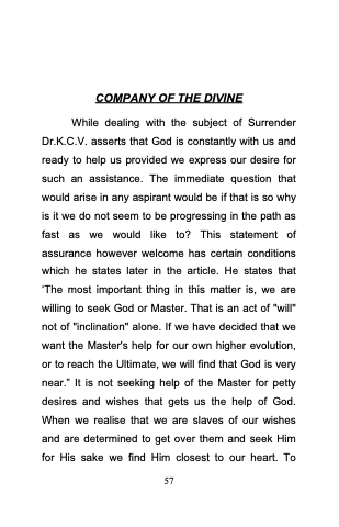 While dealing with the subject of Surrender Dr.K.C.V. asserts that God is constantly with us and ready to help us provided we express our desire for such an assistance. The immediate question that would arise in any aspirant would be if that is so why is it we do not seem to be progressing in the path as fast as we would like to? This statement of assurance however welcome has certain conditions which he states later in the article. He states that „The most important thing in this matter is, we are willing to seek God or Master. That is an act of "will" not of "inclination" alone. If we have decided that we want the Master's help for our own higher evolution, or to reach the Ultimate, we will find that God is very near.” It is not seeking help of the Master for petty desires and wishes that gets us the help of God. When we realise that we are slaves of our wishes and are determined to get over them and seek Him for His sake we find Him closest to our heart. To