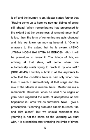 is off and the journey is on. Master states further that “Having come up to here we now get tidings of going still ahead. When remembrance has progressed to the extent that the awareness of remembrance itself is lost, then the form of remembrance gets changed and this we know on moving beyond it. “One is unaware to the extent that he is aware. (JISKO JITHNA HOSH HAI UTNA HI BEHOSH HAI) It will be premature to reveal it. The tidings of this, on arriving at that state, will come when one automatically starts trying to reach it, by one self.” (SDG 42-43) I humbly submit to all the aspirants to note that the condition here is had only when one tries to reach it automatically at that stage and the role of the Master is minimal here. Master makes a remarkable statement when he said “The sages of yore have regarded the state of acceptance of and happiness in Lords‟ will as surrender. Now, I give a prescription. “Yearning pure and simple to reach Him and Him alone!” But we should remember this yearning is not the same as the yearning we start with, it is a condition after crossing the limits of divine