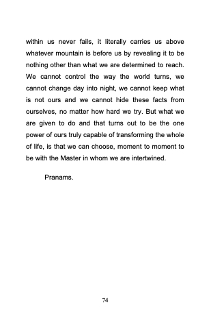 within us never fails, it literally carries us above whatever mountain is before us by revealing it to be nothing other than what we are determined to reach. We cannot control the way the world turns, we cannot change day into night, we cannot keep what is not ours and we cannot hide these facts from ourselves, no matter how hard we try. But what we are given to do and that turns out to be the one power of ours truly capable of transforming the whole of life, is that we can choose, moment to moment to be with the Master in whom we are intertwined.