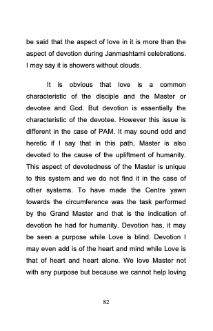 It is obvious that love is a common characteristic of the disciple and the Master or devotee and God. But devotion is essentially the characteristic of the devotee. However this issue is different in the case of PAM. It may sound odd and heretic if I say that in this path, Master is also devoted to the cause of the upliftment of humanity. This aspect of devotedness of the Master is unique to this system and we do not find it in the case of other systems. To have made the Centre yawn towards the circumference was the task performed by the Grand Master and that is the indication of devotion he had for humanity. Devotion has, it may be seen a purpose while Love is blind. Devotion I may even add is of the heart and mind while Love is that of heart and heart alone. We love Master not with any purpose but because we cannot help loving