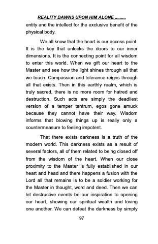 We all know that the heart is our access point. It is the key that unlocks the doors to our inner dimensions. It is the connecting point for all wisdom to enter this world. When we gift our heart to the Master and see how the light shines through all that we touch. Compassion and tolerance reigns through all that exists. Then in this earthly realm, which is truly sacred, there is no more room for hatred and destruction. Such acts are simply the deadliest version of a temper tantrum, egos gone amuck because they cannot have their way. Wisdom informs that blowing things up is really only a countermeasure to feeling impotent.