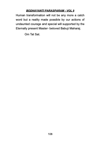 BODHAYANTI PARASPARAM - VOL 9 Human transformation will not be any more a catch word but a reality made possible by our actions of undaunted courage and special will supported by the Eternally present Master- beloved Babuji Maharaj. Om Tat Sat. 108