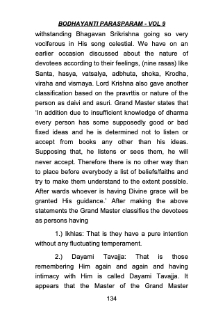 withstanding Bhagavan Srikrishna going so very vociferous in His song celestial. We have on an earlier occasion discussed about the nature of devotees according to their feelings, (nine rasas) like Santa, hasya, vatsalya, adbhuta, shoka, Krodha, viraha and vismaya. Lord Krishna also gave another classification based on the pravrttis or nature of the person as daivi and asuri. Grand Master states that ‘In addition due to insufficient knowledge of dharma every person has some supposedly good or bad fixed ideas and he is determined not to listen or accept from books any other than his ideas. Supposing that, he listens or sees them, he will never accept. Therefore there is no other way than to place before everybody a list of beliefs/faiths and try to make them understand to the extent possible. After wards whoever is having Divine grace will be granted His guidance.’ After making the above statements the Grand Master classifies the devotees as persons having