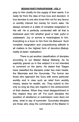 pray to Him chiefly for the supply of their wants. It is really far from the idea of true love and devotion. A true devotee is one who loves Him not for any favour or worldly interest but merely for love's sake. He always remains in a state of complete resignation to His will. He is perfectly contended with all that is bestowed upon him whether good or bad, joyful or unpleasant. Joy or sorrow is meaningless to him. Everything is a boon to him from his Beloved. Such complete resignation and unquestioning attitude in all matters is the highest form of devotion.(Babuji- reality at dawn- realisation)